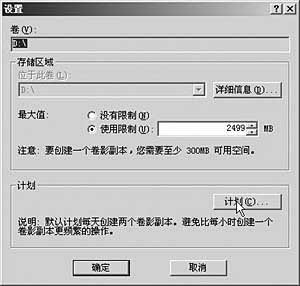 4.在“最大值”后面设置存储卷影副本的最大空间。单击“计划”打开“日程安排”对话框,在此可以定制复制计划,也可以删除系统默认的计划,而定制适合自己的复制时刻。